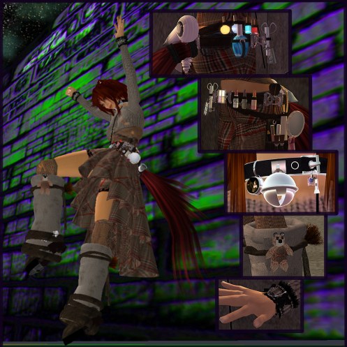 Small Inset Photos, from top to bottom: Makeup belt, back (yes, that *is* a blow-dryer); Makeup belt, front; Eat Rice! Charm collar; Boot details on the Elle et Lui / N@rkotic outfit; Curious Kitties “Wub” bracelets (click on image to enlarge)