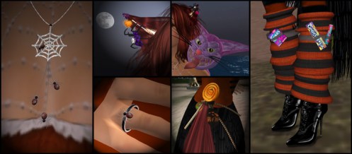 Left: EarthStones’ Eww Spider! Necklace; Top L: Sweet Leonard Trick-or-Treat Ears’ Top R: CatNip’s Cheshire Cat; Bottom L: EarthStones’ Eww Spider! Ring; Bottom R: Atomic’s Trick-or-Treat Tail; Right: Riddle’s Halloween legwarmers and Bax Coen’s Ankle Boots.  (Click photo to enlarge)