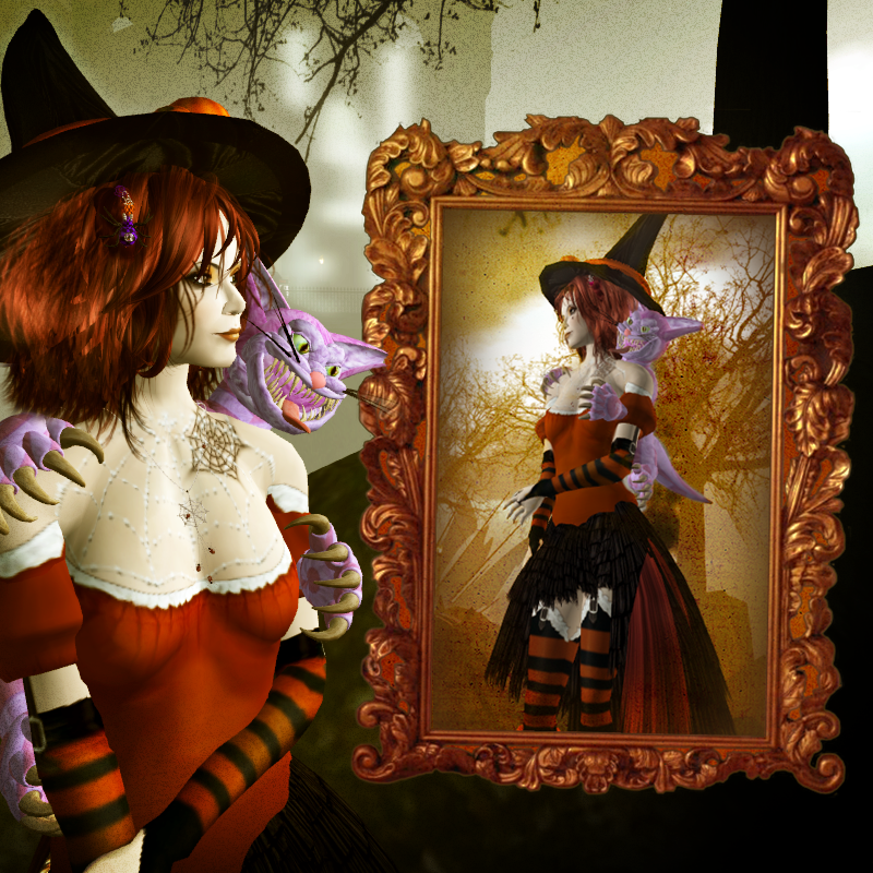| Outfit | Glamurena Studio: Halloween Pumpkin set (includes the shirt with prim puffed shoulders, optional black bodice, flexi skirt, striped stockings with garter belt and prim ankle puffs, and a cute witch’s hat)