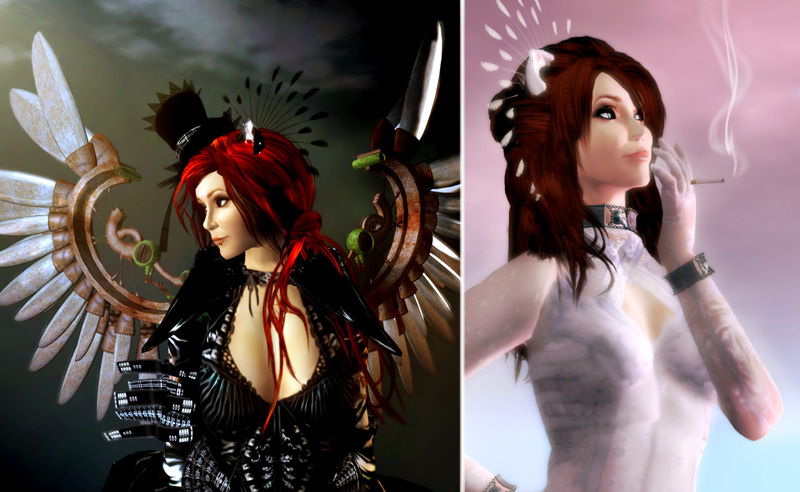 Left: Defectiva’s “Infinity” wings | Middle: EarthStones Slave Cuffs | Right: Elegance Hats hair feathers; Eat Rice’s ears; EarthStones Slave Collar; SbZ Eye Fidelity Neko eyes