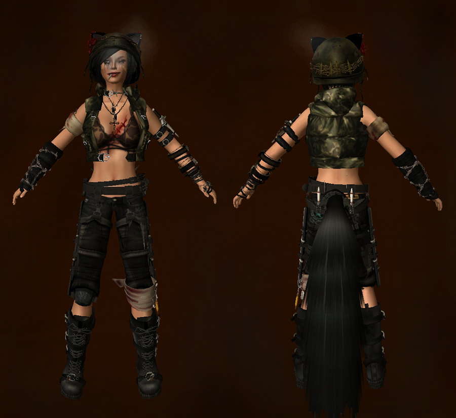 | Belt, Leg Straps, Leg Weapons, Pants, and Knee Armor | Dirty Lynx: all part of the “Sayomi” outfit — an incredible package with many more pieces than you see here, including an excellently designed heavy jacket, torn tank top, palestine scarf, and combat boots, PLUS a shape, skin, hair, and prim eyes! (Note: I edited the jeans to make them crop length instead of full length). Just want the pants/belt/leg weapons? No problem… they’re sold separately on the first floor of the store “Sayomi Combat Shorts.”