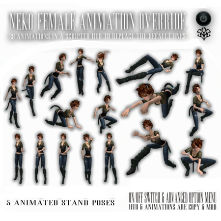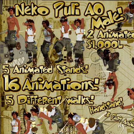Unless you’re new to SL, you’ve probably already got some form of AO (animation overrider) active on your avatar, which makes you move more smoothly and naturally. If you want to take your Neko look one step further, you can purchase a specific Neko AO that contains cat-like movements such as a “crouch” landing, scratching, paw-licking, and other similar animations. There are even Neko HUDs with various Neko sounds and gestures just one menu button away. This page of Neko Animations lists all sorts of stores that will help you get your Neko attitude on.