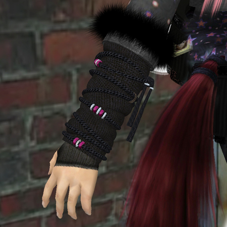 This is one of my favorite aspects of “being Neko” — the range of imaginative Neko accessories. The most commonly worn items are accessory belts, thigh straps, and arm bands, often bedecked with a variety of cat toys, fishbones, food, buckles, spikes, flexi bits, and unique prim objects ranging from humorous to combative.