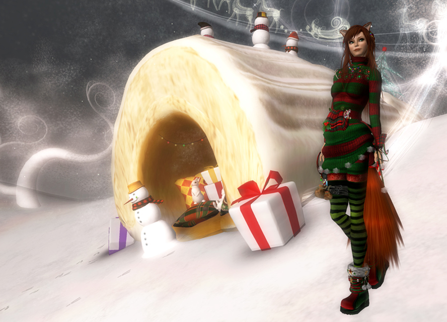 | Elf Sweater Dress and Coat (worn separately) | !gO! (by Gocha Merlin): Christmas Elf Girl (comes with a complete elf avatar, a cute AO, a “cold breath” animation, a smile animation, a bell you can ring, pointy elven boots, and an adorable hat… which I would have LOVED to wear for you all, but it was permanently attached to a hairstyle that just wasn’t me… pity the hat’s not sold separately!)