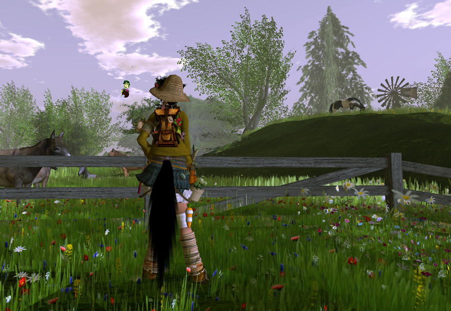 What sort of gardening inspiration might you find here? Gorgeous saltwater marshes in the Gulf of Lune (photo above), beautiful pastures and meadows on Dimrill Dale and Glanduin (where our photos were taken), and a large, well-appointed log lodge on Eryn Vorn. Love to ride horses in Second Life? Check out the extensive equestrian trail network on Mirromere or the sunlit forest paths of South Farthing. Prefer a more Asian setting? Visit the private tea pagoda in the Misty Mountains, and when you’re finished, check out its glowing caves, secluded cabins, or the sleeping bag for two.