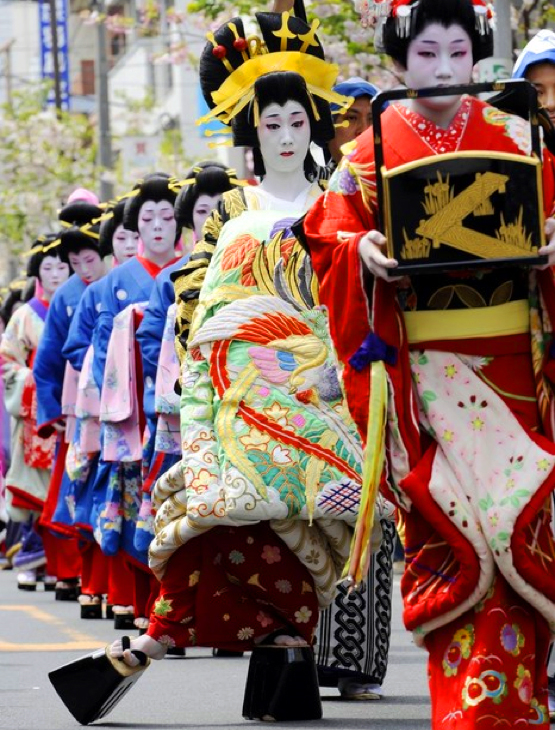 Next let’s move on to her attitude. Just like a diva, the Oiran never traveled discretely. Her every appearance was heralded by a formal “dochu” — an iconic procession in full regalia making its stately, colorful, and often noisy way to the esteemed customer’s location.